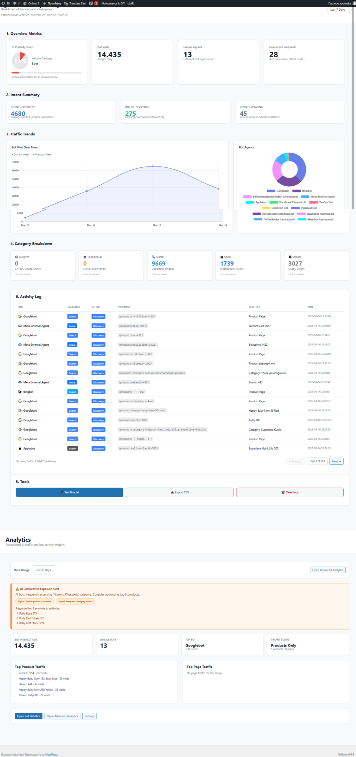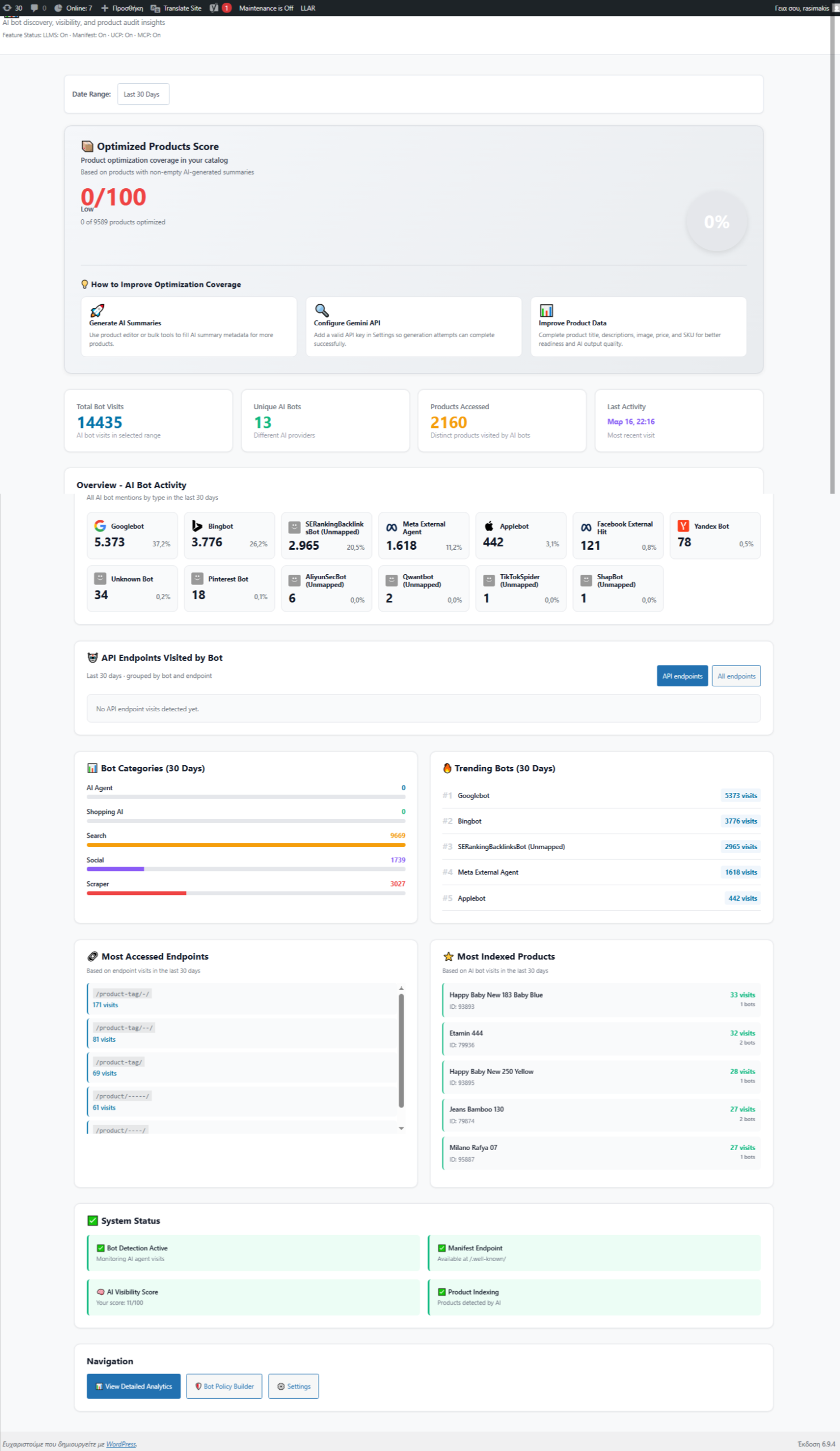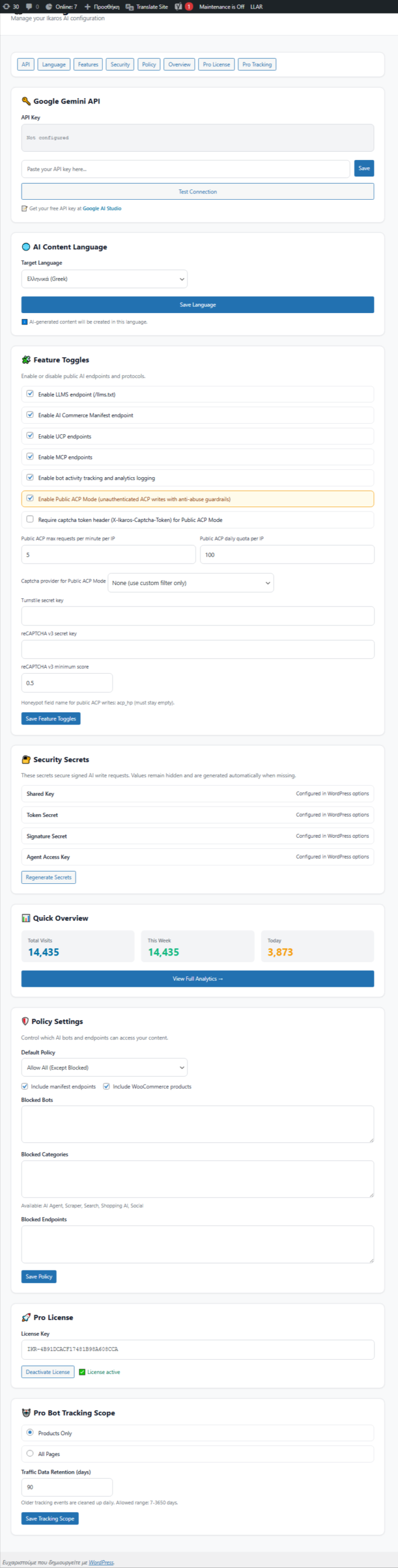IKAROS is a free, open-source WooCommerce plugin that transforms your store into an AI-ready commerce platform. It generates machine-readable product data, serves discovery endpoints, and provides comprehensive insights into how AI bots and crawlers interact with your content. Whether you’re optimizing for AI shopping agents, search engine crawlers, or future agentic protocols, IKAROS bridges the gap between traditional e-commerce and the AI-native internet.